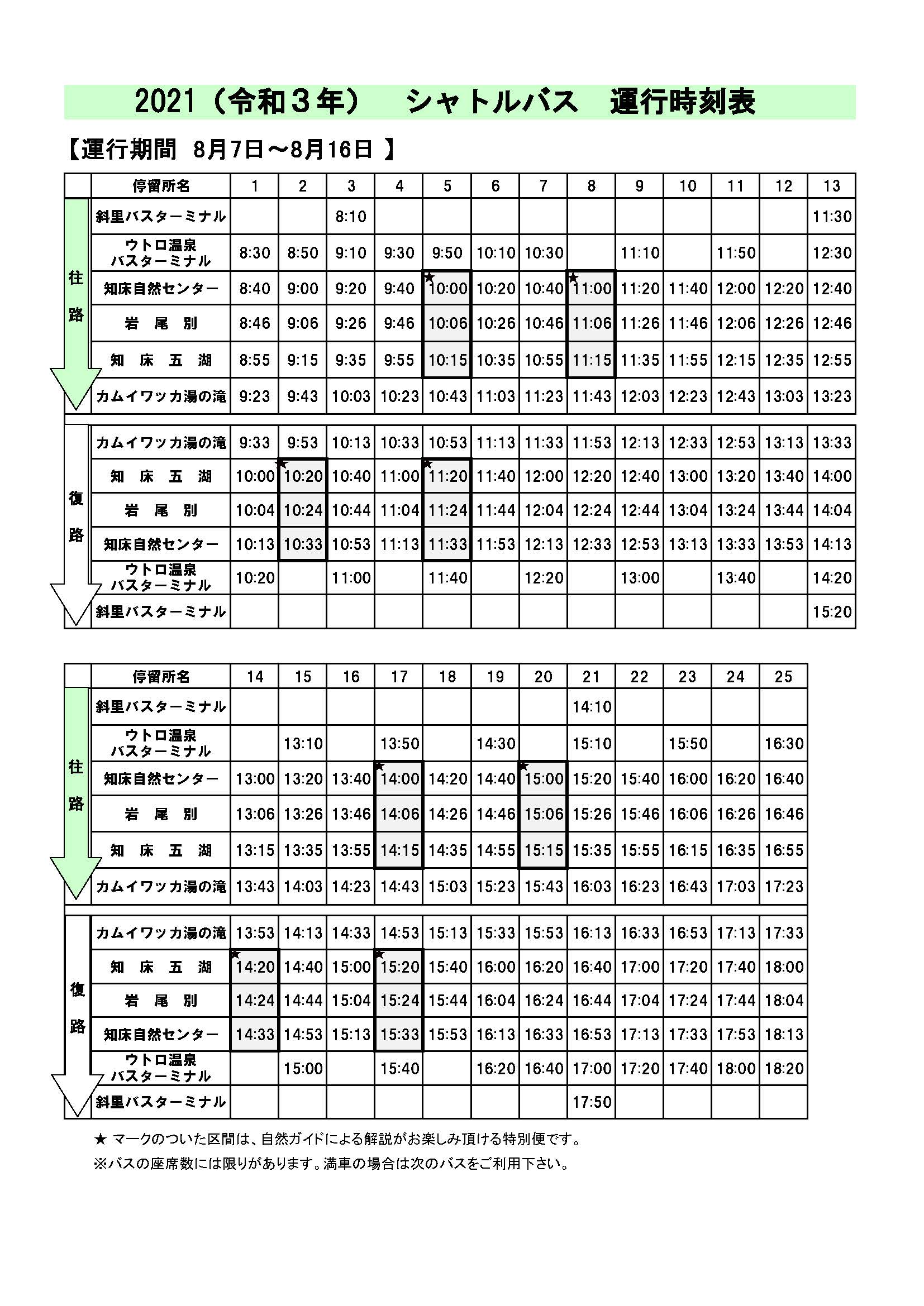 今年 令和3(2021)年度のカムイワッカ林道マイカー規制は8月6日から8月16日となってます。