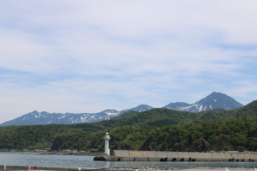 写真は去年の6月上旬に港から撮影した知床連山です。知床連山には新緑と共にまだ雪が残っているのが特徴。